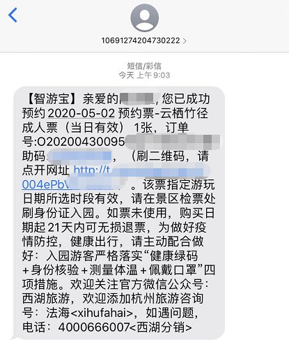 在预约成功的时候,大家手机上应该会收到一则短信的。到时候去到景区门口点开短信中的链接,出示进行核验就可以入园游玩啦!