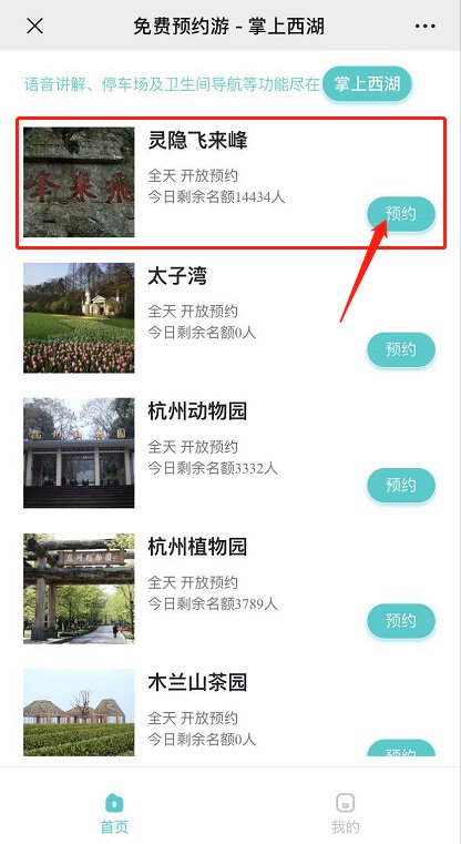 四,登陆成功以后,返回到最初的页面,假如小编要预约灵隐飞来峰景区,那么点击飞来峰景区名称后面的预约按钮。如下图红色箭头所指。