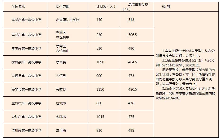 全市一般普通高中学校录取最低控制分数线为:孝感市直属初中学校、孝南区330分,孝昌县341分,大悟县325分,云梦县385分,应城市360分,安陆市360分,汉川市338分。根据学校招生计划,按照“考生分数优先、遵循志愿顺序”的原则录取,录满为止。
