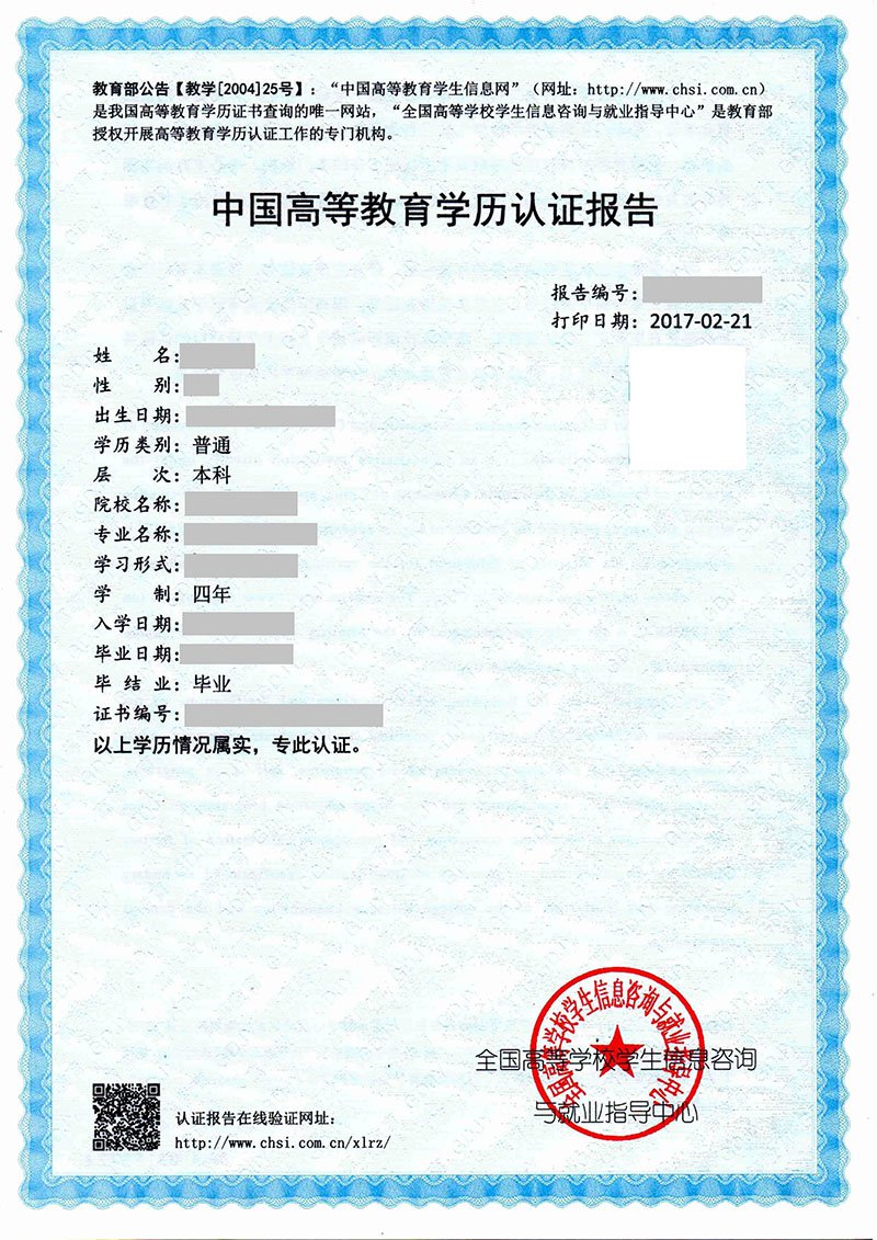 | 2.学位证、学位认证材料。学位认证材料主要包括通过中国学位与研究生教育信息网在线打印的查询结果(样本)或直接通过其网上申请出具的认证报告(样本)。 | 2.对毕业证或学位证书遗失或损坏的,须提供学校出具教育部规定样式的“学历证明书”。 | |||