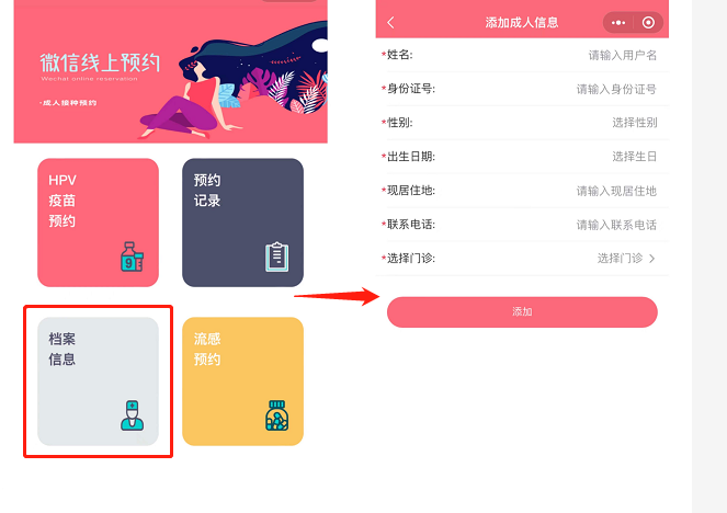 (2)点击菜单栏内“HPV预约”——点击“档案信息”,添加成人信息,建立档案——回到主页面,点击“HPV疫苗预约”,选择您所需要预约的疫苗类型。按照提示,选择接种人、预约门诊,最后点击“预约”,即可完成预约。