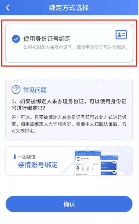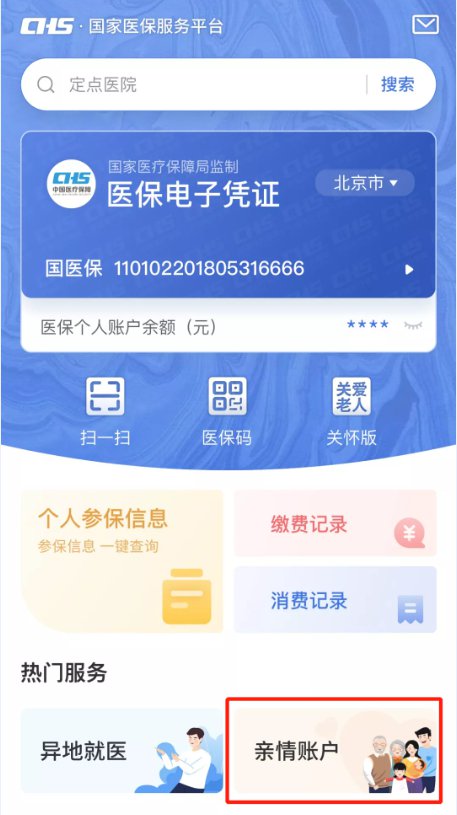 在国家医保服务平台APP首页点击【亲情账户】进入亲情账户页面,选择“使用身份证号绑定”即可添加家人的亲情账户。