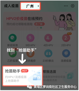 2、选择“广州”地区,点击医鹿APP首页 “成人疫苗” ,进入页面后再点击“抢苗助手”