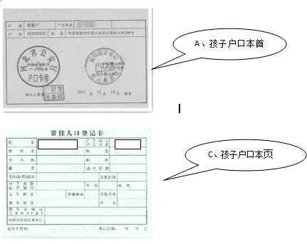 (复印件复印内容:A、户主页公安印章的那页;B、适龄儿童父、母的那页;C、适龄儿童本人页D、父、母与适龄儿童不在一本户口本的还应提供结婚证或出生证;父母离异的提供离婚证、离婚协议书。)户口簿复印需知:A和C要上下排版印在同一页;父与母两人也要上下排版印在同一页。