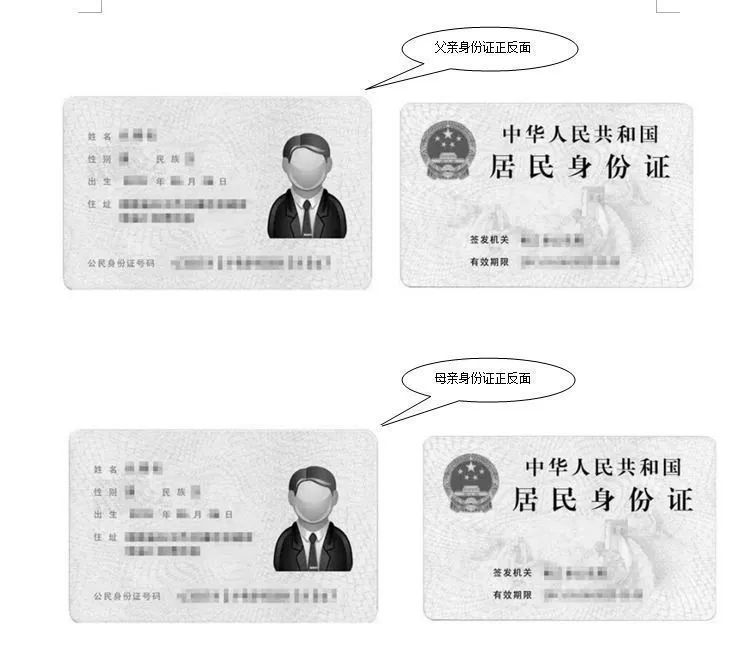 父亲身份证+母亲身份证 复印件1份(复印在同一张纸同一面)