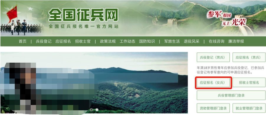 登录全国征兵网,点击“应征报名(女兵)”进入页面。