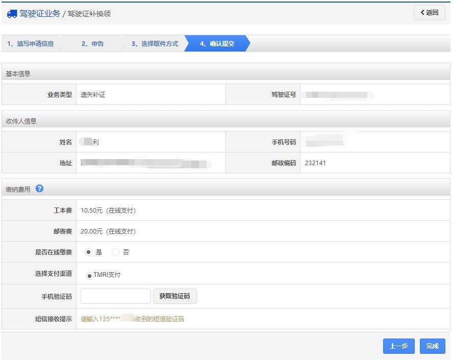 4、确认提交:该步骤显示用户的驾驶证信息、领取详情以及需要缴纳费用信息,如果平台已开通在线支付功能,显示在线支付详情。