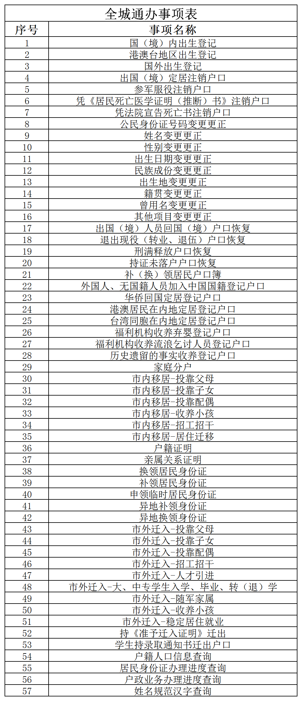 出生登记、市外迁入、市内迁移、项目变更、身份证换补领等高频户籍业务均已实现全城通办。具体业务和全市户籍窗口分布情况详见下表。