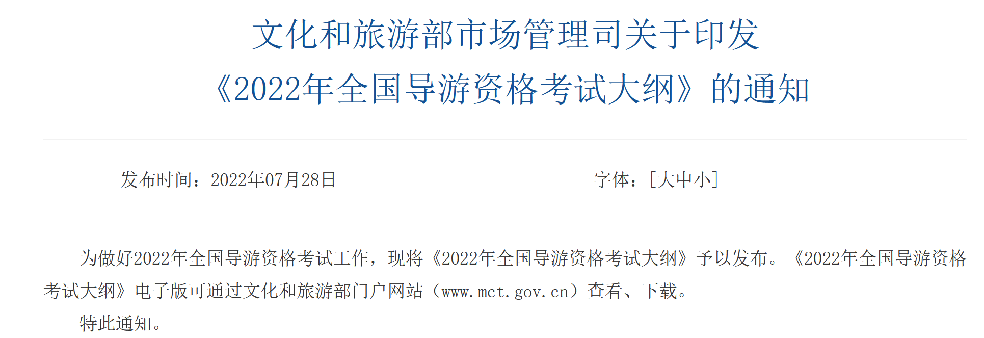 2022年全国导游资格考试大纲可通过文化和旅游部政府门户网站下载。