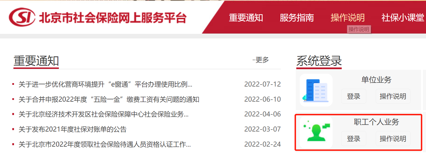 2、访问北京市社会保险网上服务平台http://rsj.beijing.gov.cn/csibiz,通过“职工个人业务”的登录入口访问北京市统一身份认证平台,使用相同的手机号码重新接收短信登录进入北京市社会保险网上申报系统;