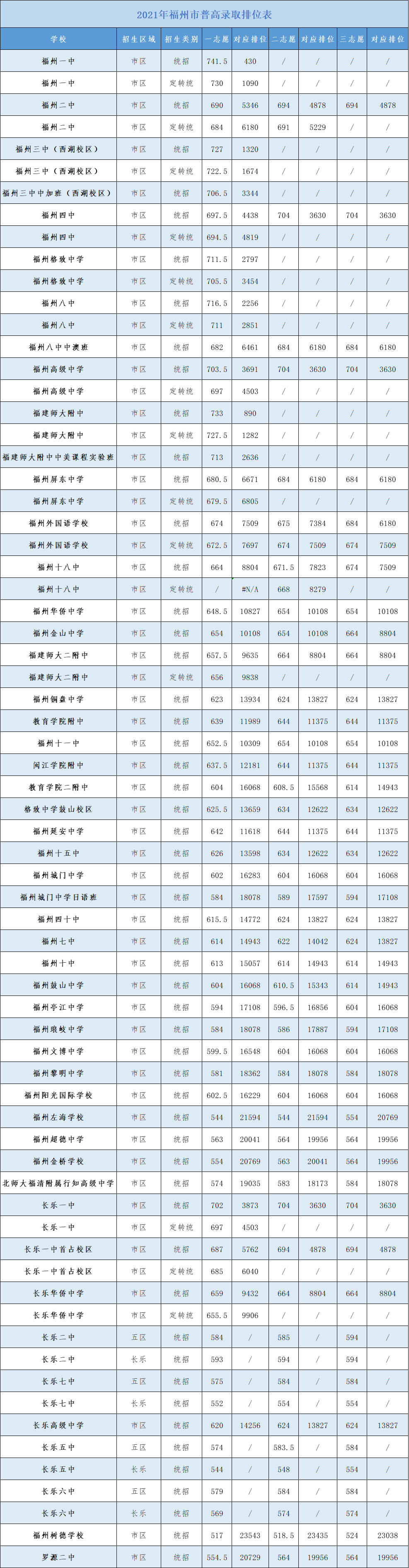 考生可根据自己的二检分数在新的质检排位表上找到排名,再用排名对照2021年福州市普高录取排位表进行志愿填报
