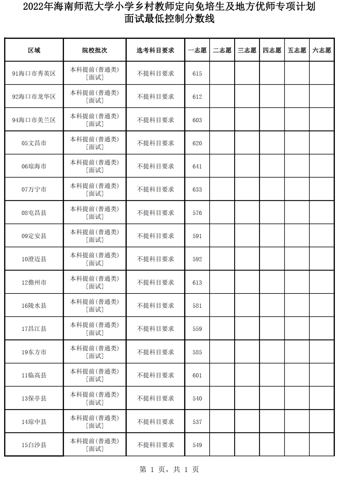 2022年海南师范大学小学乡村教师定向免培生及地方优师专项计划面试最低控制分数线