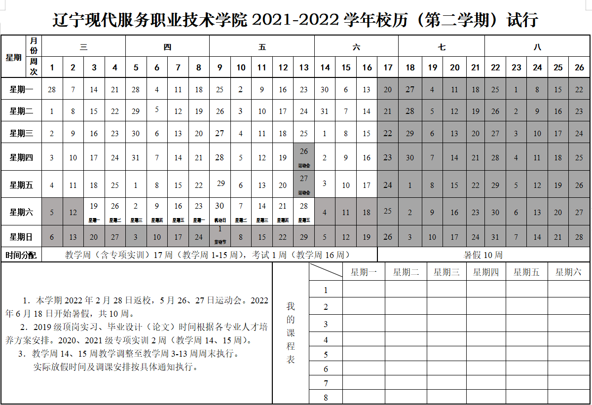 辽宁现代服务职业技术学院2021—2022学年校历: