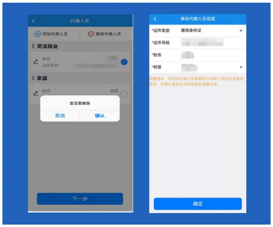 5、勾选已添加的代缴人,点击【删除代缴人员】,可以删除已添加代缴人记录。点击信息前方的修改图标,可以修改代缴人信息。