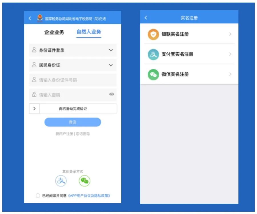 自然人可分别采用银联、支付宝或微信实名认证注册三种方式注册。自然人登录支持“身份证件号码+密码”登录、支付宝授权登录和微信授权登录。