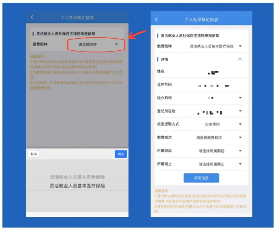 4、点击【灵活就业人员社保自缴】菜单,选择缴费险种,系统自动提取当前登录自然人的灵活就业登记信息,再选择登记所在地、核定提取方式等信息后,点击【核定信息】。