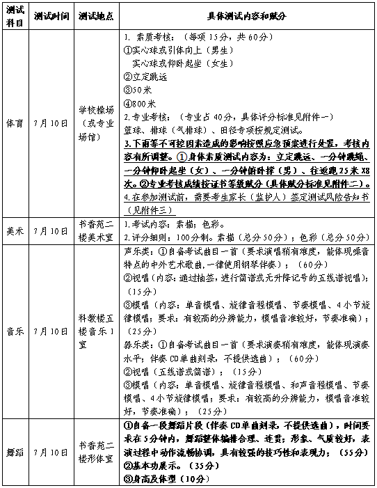 2.音乐、舞蹈特长生要求中考总成绩C+(含C+)以上,单科没有D及以下;美术特长生要求中考总成绩B(含B)以上;体育特长生要求中考总成绩C+(含C+)以上,单科没有D及以下;
