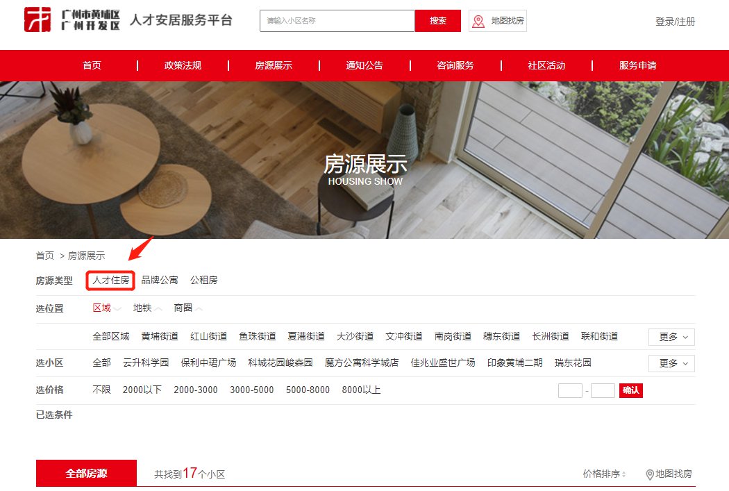 第一步:在黄埔区人才安居服务平台上找到“房源展示”,并且点击“人才住房”,如下图所示: