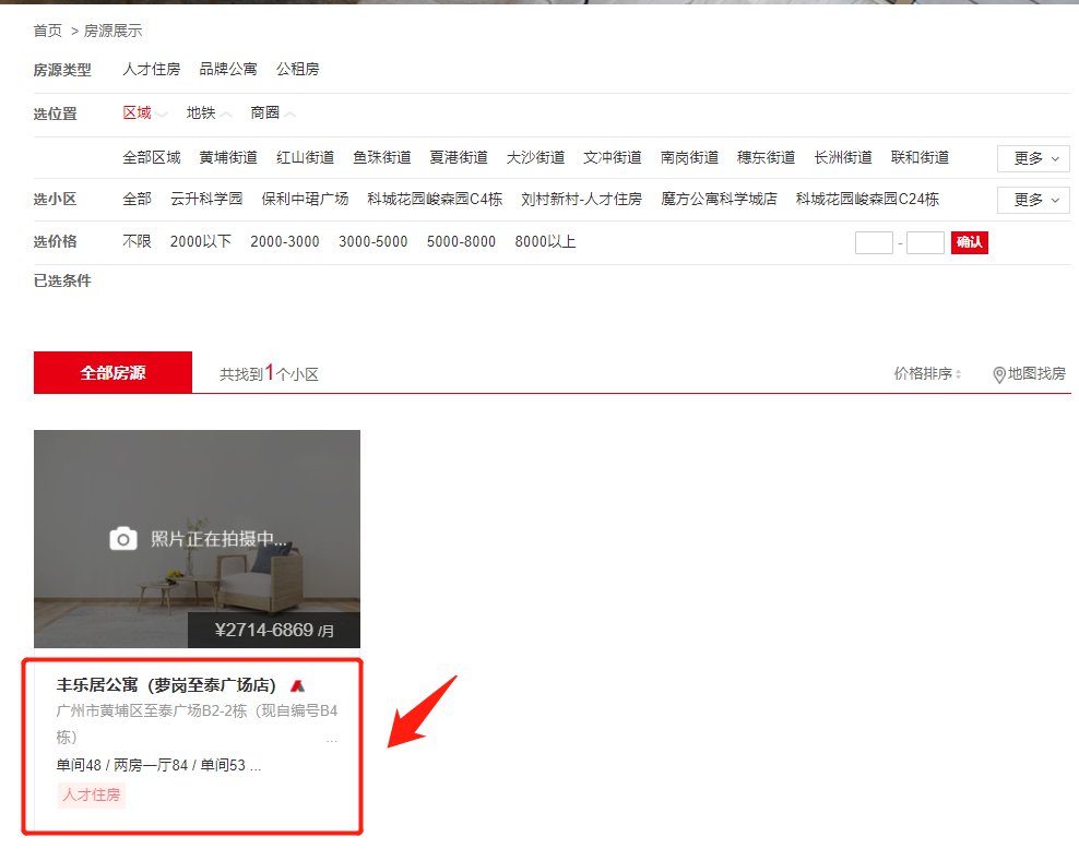 第二步:在人才住房小区中找到“丰乐居公寓”或“佛伦斯中心”,并点击进入,如下图所示: