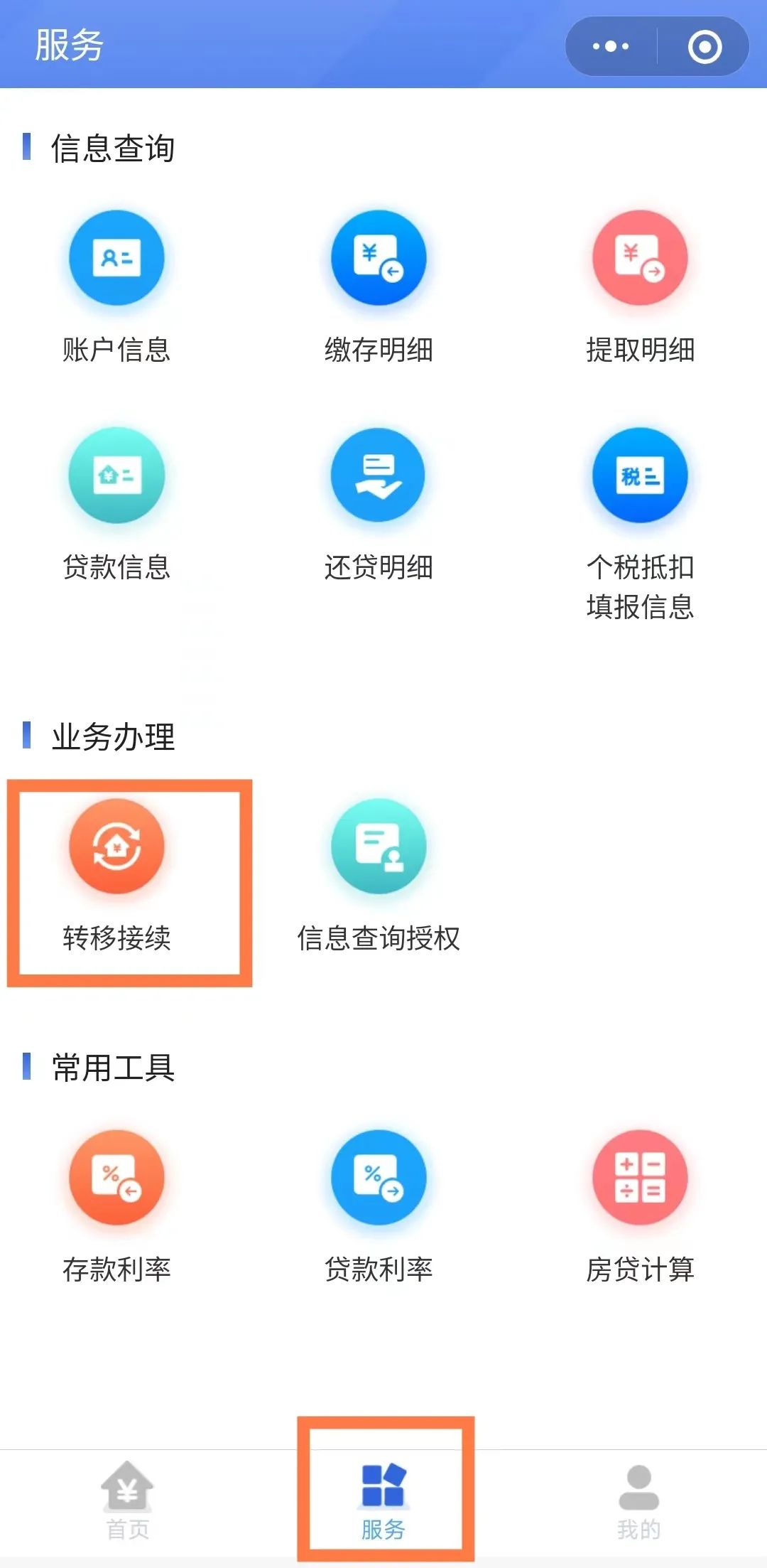 点击底部“服务”栏,在“业务办理”栏目选择“转移接续”