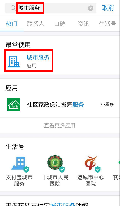 第一步,打开支付宝,点击“城市服务”,或者在搜索框输入:城市服务,直接搜索。