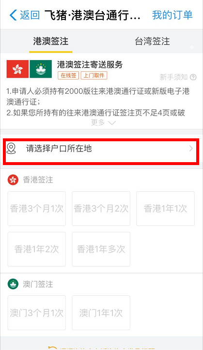 第三步,点击港澳台签注,选择户籍所在地和签注类型