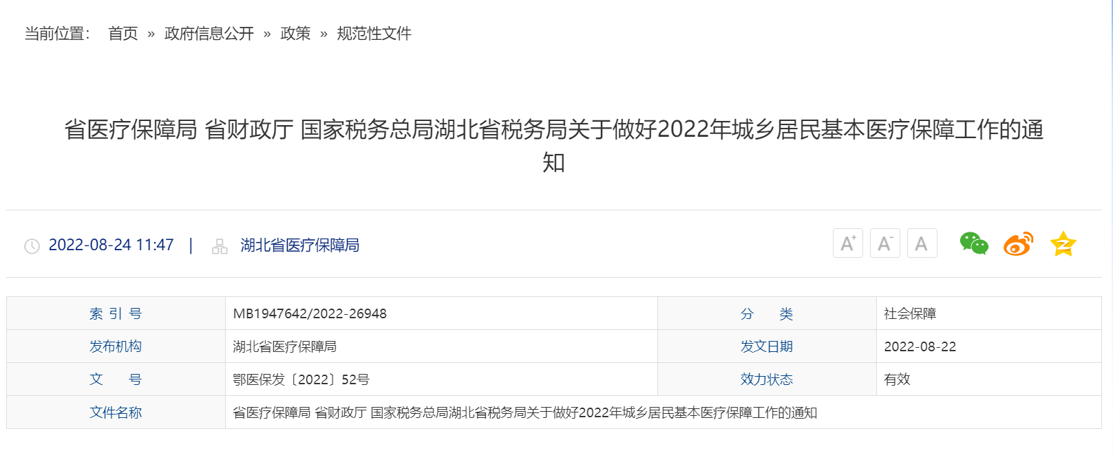 省医疗保障局 省财政厅 国家税务总局湖北省税务局关于做好2022年城乡居民基本医疗保障工作的通知