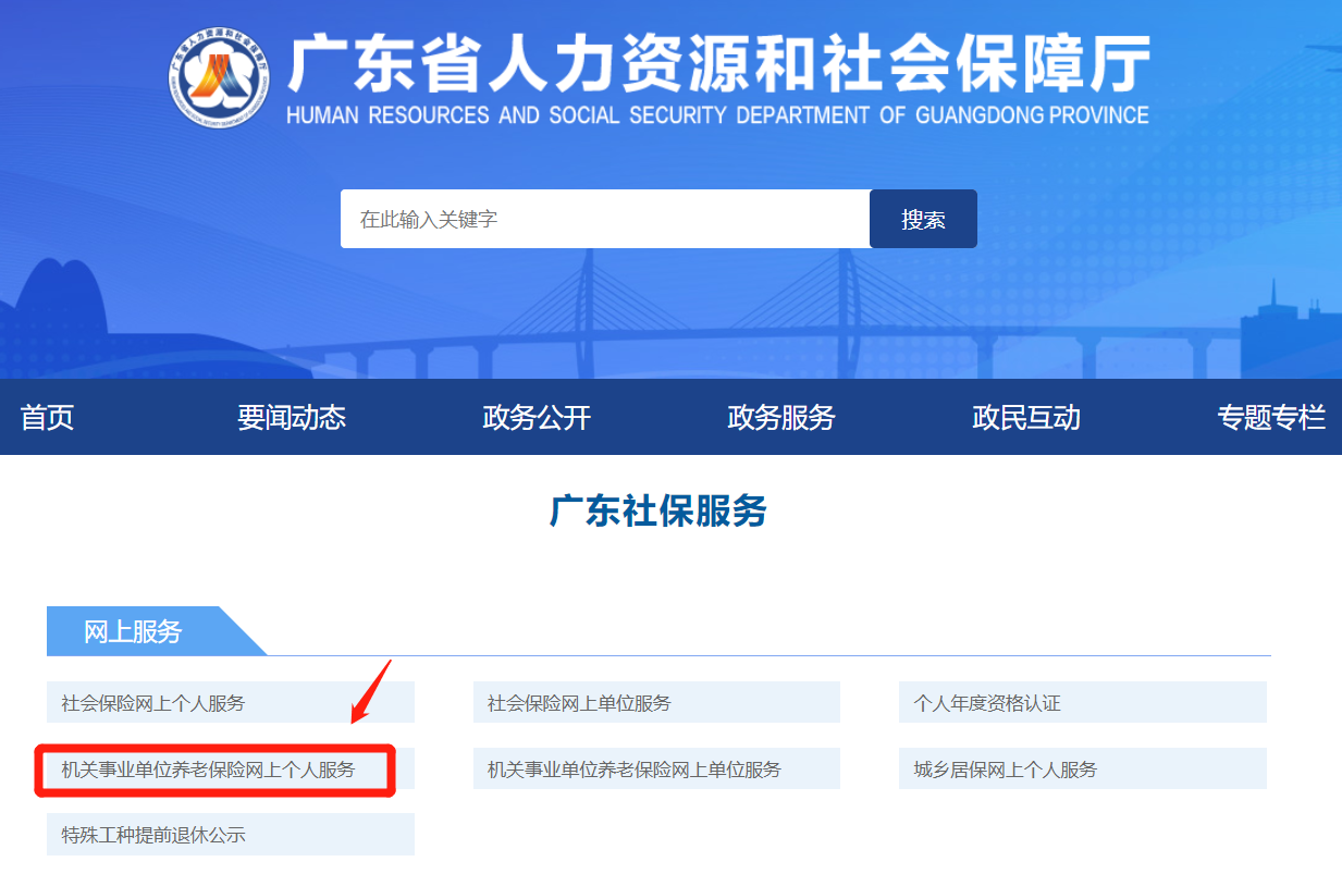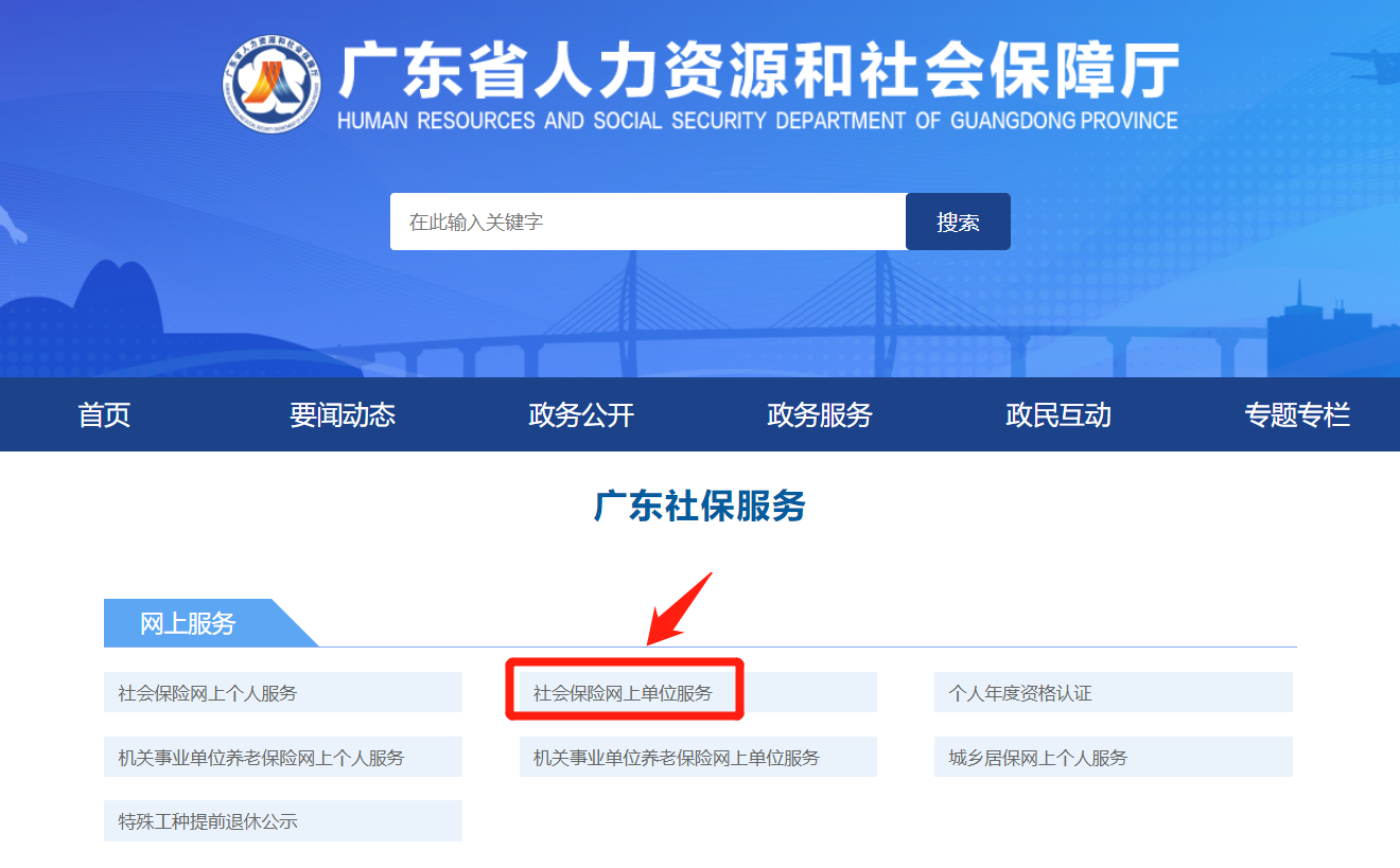 第一步:打开广东省人力资源和社会保障厅-广东社保服务(网址:http://hrss.gd.gov.cn/gdsbfw/),点击【社会保险网上单位服务】,使用单位账号、或者是绑定的经办人账号登录后进入系统。
