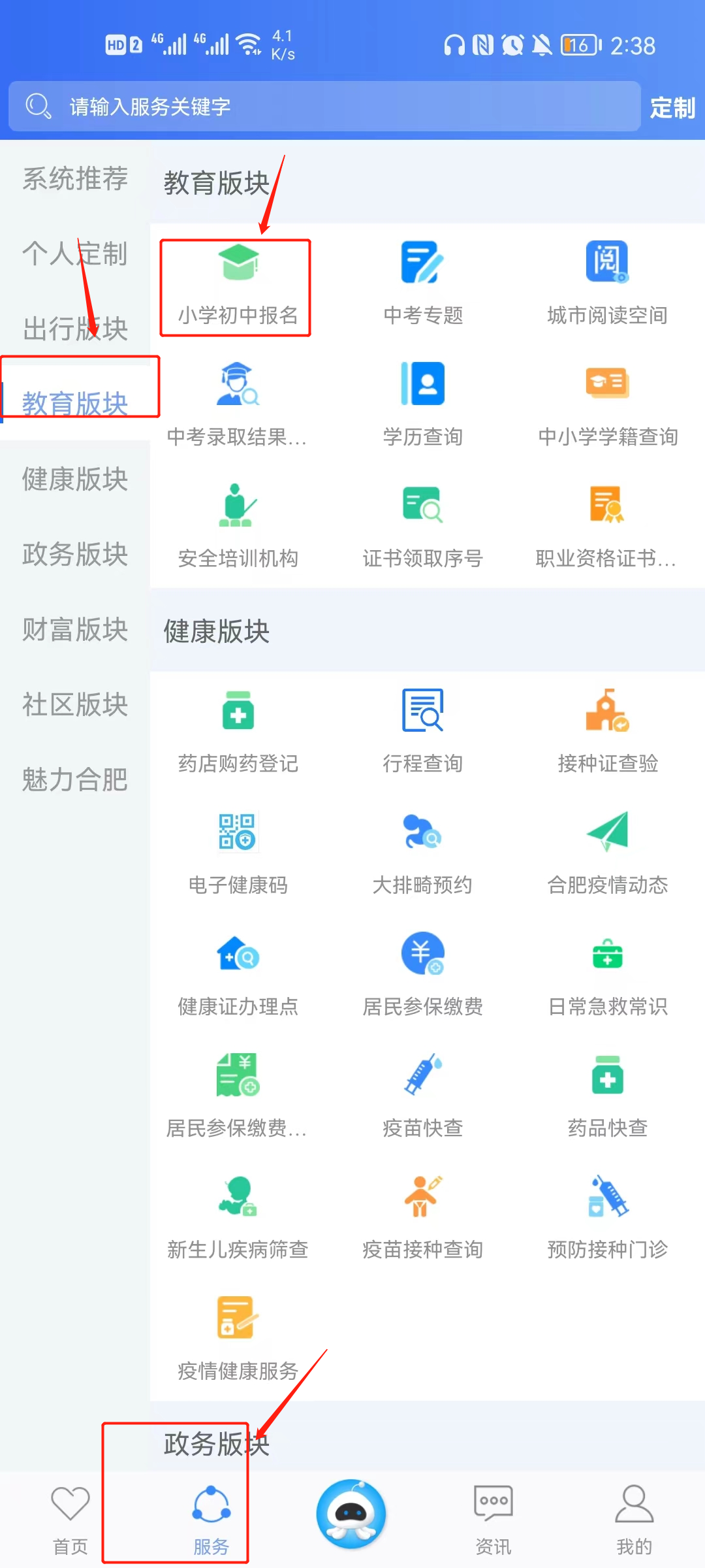 第一步:合肥通首页,打开“服务”板块,找到“教育板块”,点开“小学初中报名”