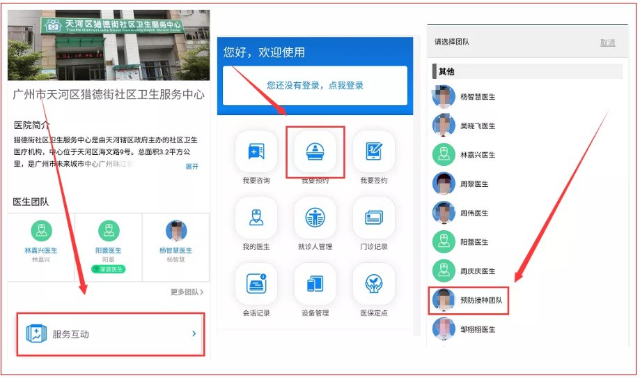 关注“天河区猎德街社区卫生服务中心”公众号,点击菜单栏“预约挂号——预约门诊或接种”进行预约。(提示:预约前请进入公众号核实是否可以预约,是否有苗。)