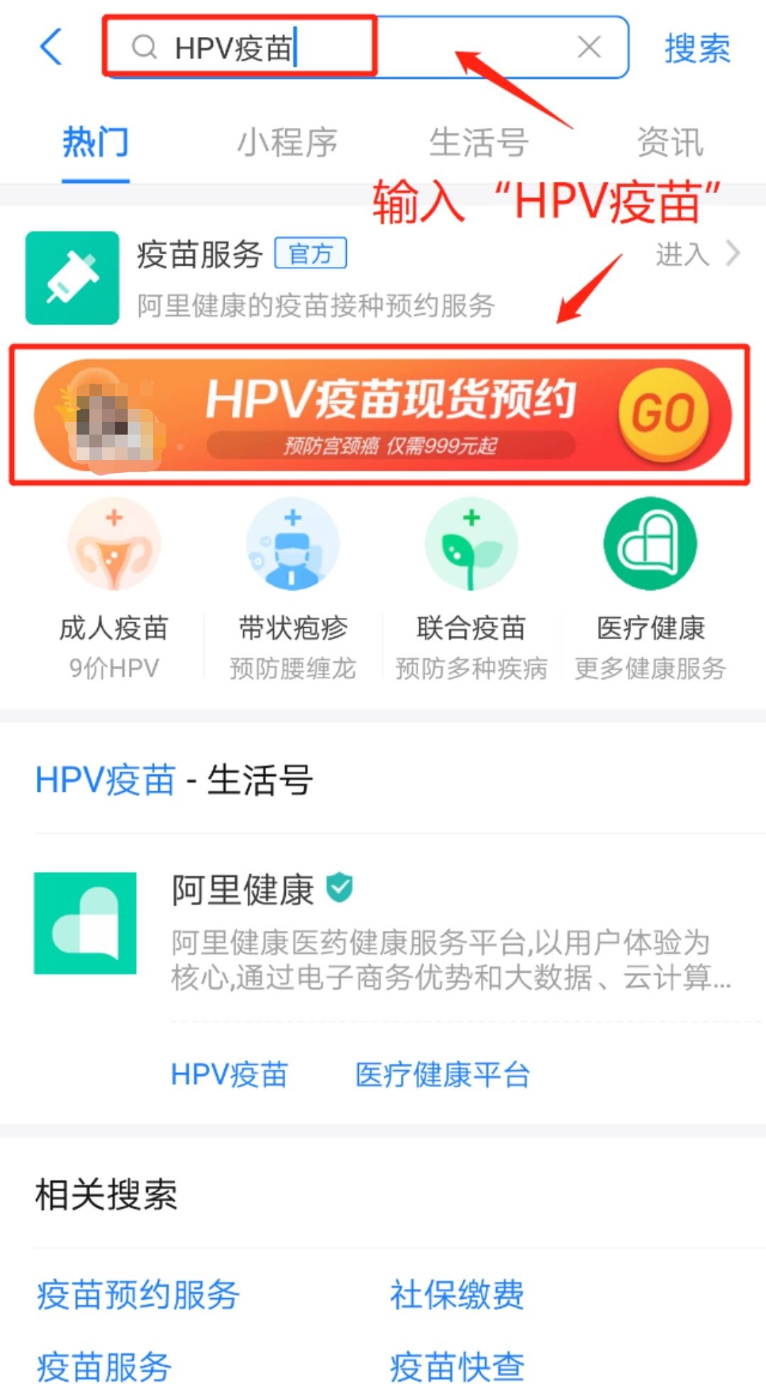 第一步:下载并打开支付宝APP,在首页搜索“HPV疫苗”或者“疫苗服务”,选择“HPV疫苗现货预约”;