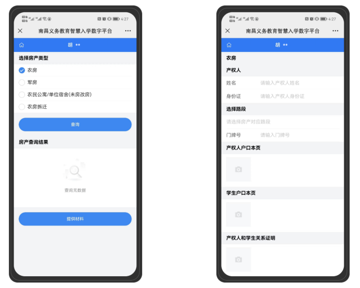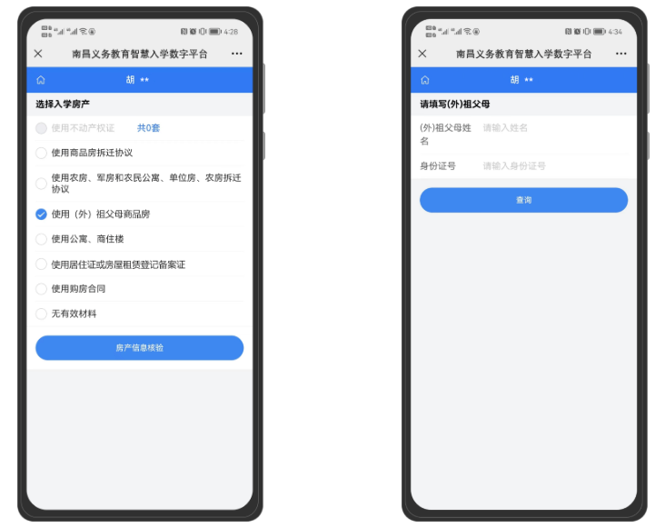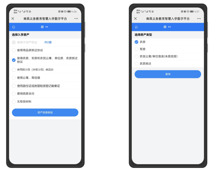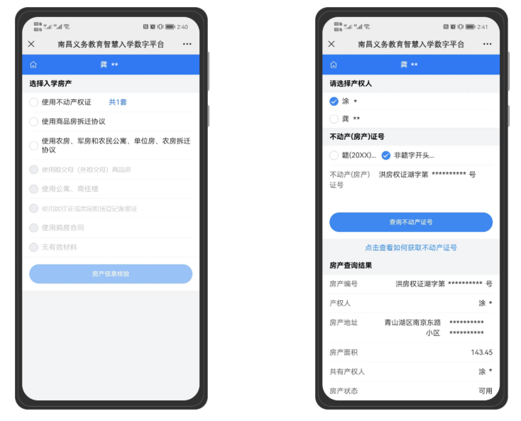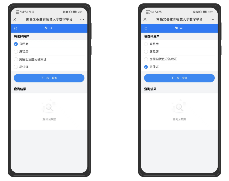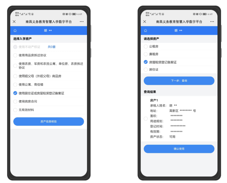 如小学毕业生及父母在南昌城区均无房产,可以选择使用居住证或房屋租赁登记备案证,平台将自动查询。