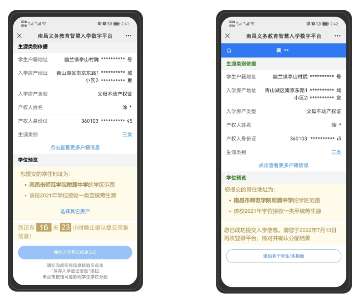 确认使用房产后可查看生源类别,所属学区预览;保存入学信息后,如有多胞胎小孩可添加多胞胎入学信息;