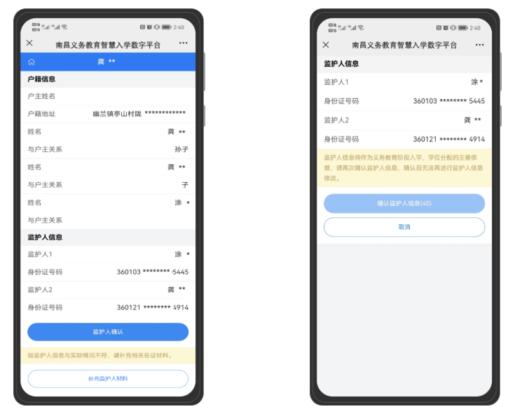 如户籍、监护人信息无误,则直接确认;如监护人信息与实际不符,可补充相关材料进行监护人核验;