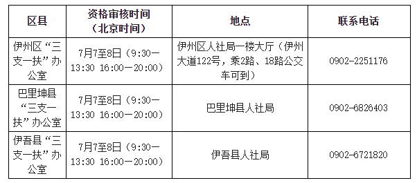 网上报名通过资格审核后,下载打印《“三支一扶”报名信息确认表》,并在各区(县)“三支一扶”办公室规定时间内,携带《“三支一扶”报名信息确认表》《毕业证》原件、户口本原件和报到证原件到所属区(县)“三支一扶”办公室进行现场确认。各区(县)“三支一扶”办公室现场资格审核时间、地点具体如下: