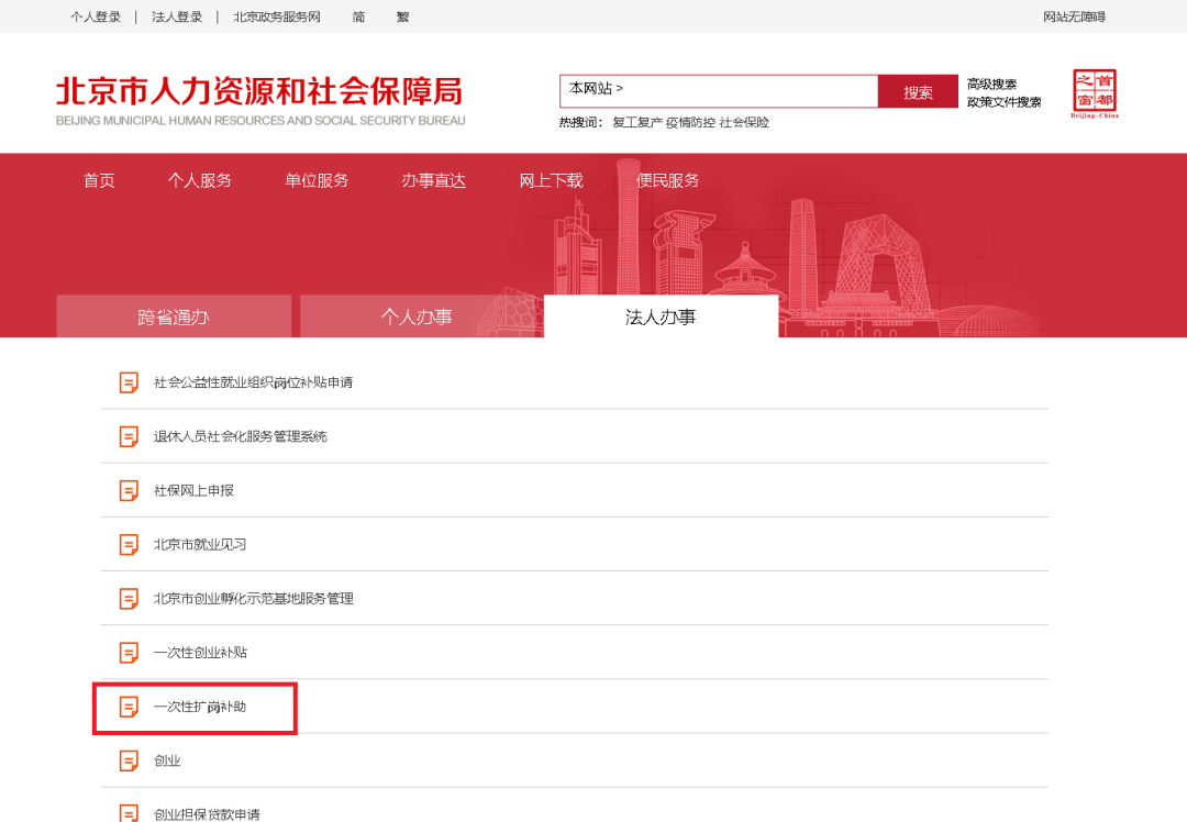 8月19日,在北京市人力资源和社会保障局官方网站(http://rsj.beijing.gov.cn)“法人办事”版块中上线了“一次性扩岗补助”栏目,用人单位可以在网上申请一次性扩岗补助了。