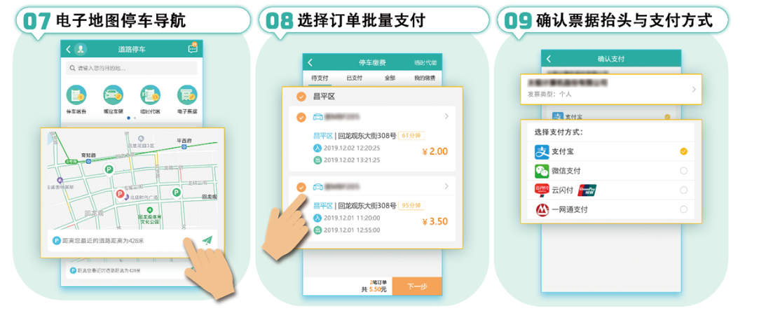 第三步:停车&缴费停车人可通过主页面下方的"电子地图",实时查看附近或目的地周边的道路电子收费车位,并实现停车导航。停车入位后,前端设备创建停车订单,开始计时计费。停车人可在APP道路停车主页面实时获取订单信息。车辆驶离车位后,订单自动完成结算,停车人可通过微信、支付宝、银联云闪付、招行一网通等方式,完成单笔或批量缴费。