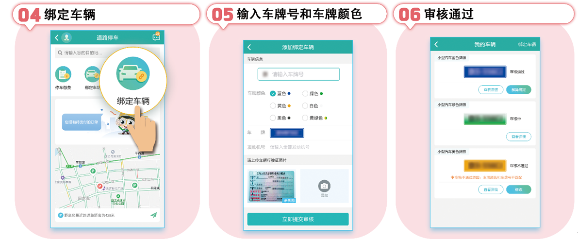 第二步:绑定车辆停车人登录"北京交通"APP账号后,点击"绑定车辆",输入车辆号牌、车牌颜色、发动机号码、上传车辆行驶证照片,系统于24小时内完成审核反馈,停车人可在"我的车辆"查看审核结果和详情。对于京牌车辆,首次申请时无需再上传行驶证照片。