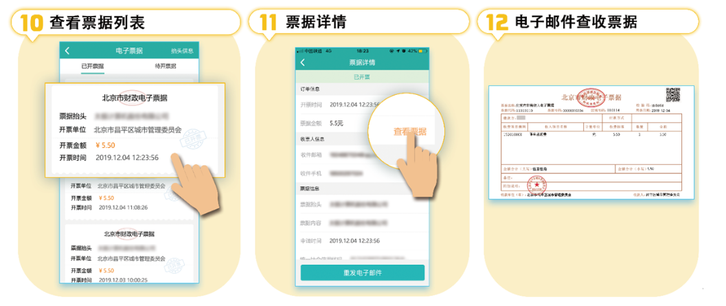 第四步:查看票据道路停车电子收费全部采用财政监制的电子票据。停车人在缴费时应先选择开票信息,再进行支付,电子收费系统同步自动开具电子票据,并发送至停车人邮箱。点击APP主页面"电子票据",可查看所有票据列表和票据详细信息。