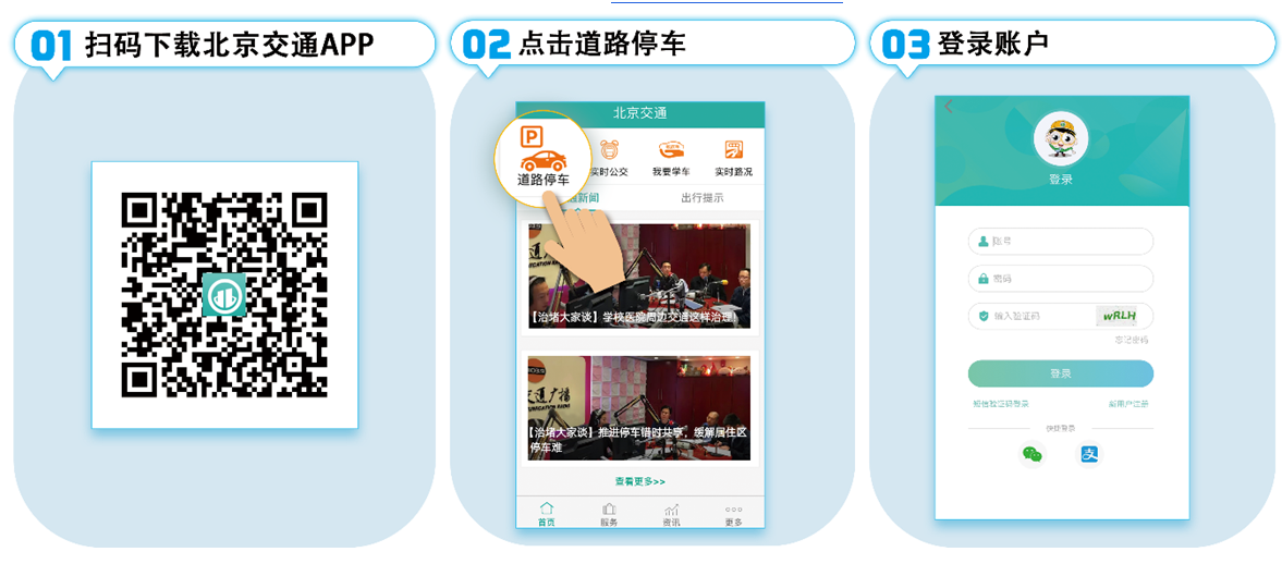 第一步:下载APP并注册登录可在电子收费停车场明码标价牌、发放的宣传手册上找到APP下载二维码,扫码下载;也可在智能手机的"APP应用商店"里搜索"北京交通"进行下载。下载完成后,点击"道路停车",通过手机号进行注册登录;也可以授权微信和支付宝进行快捷登录。