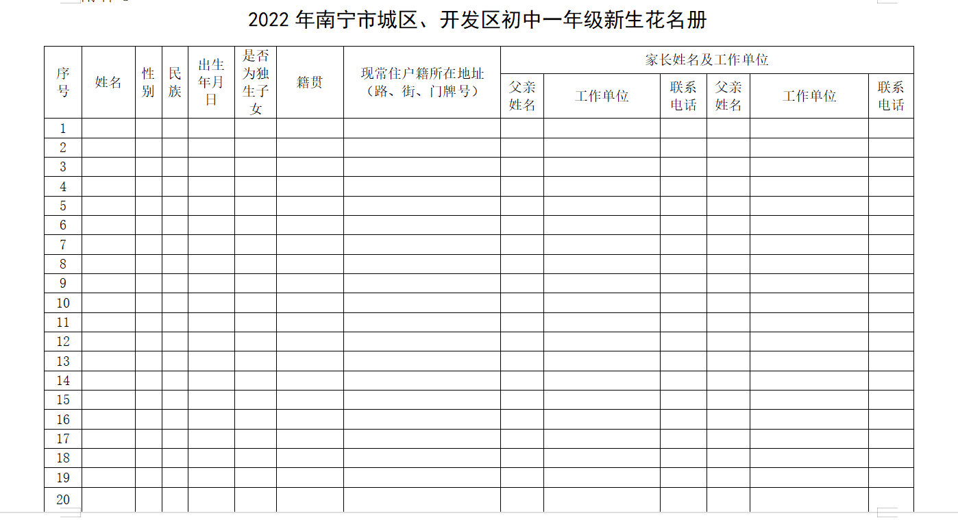 附件:1. 2022年南宁市市区初中新生入学登记表