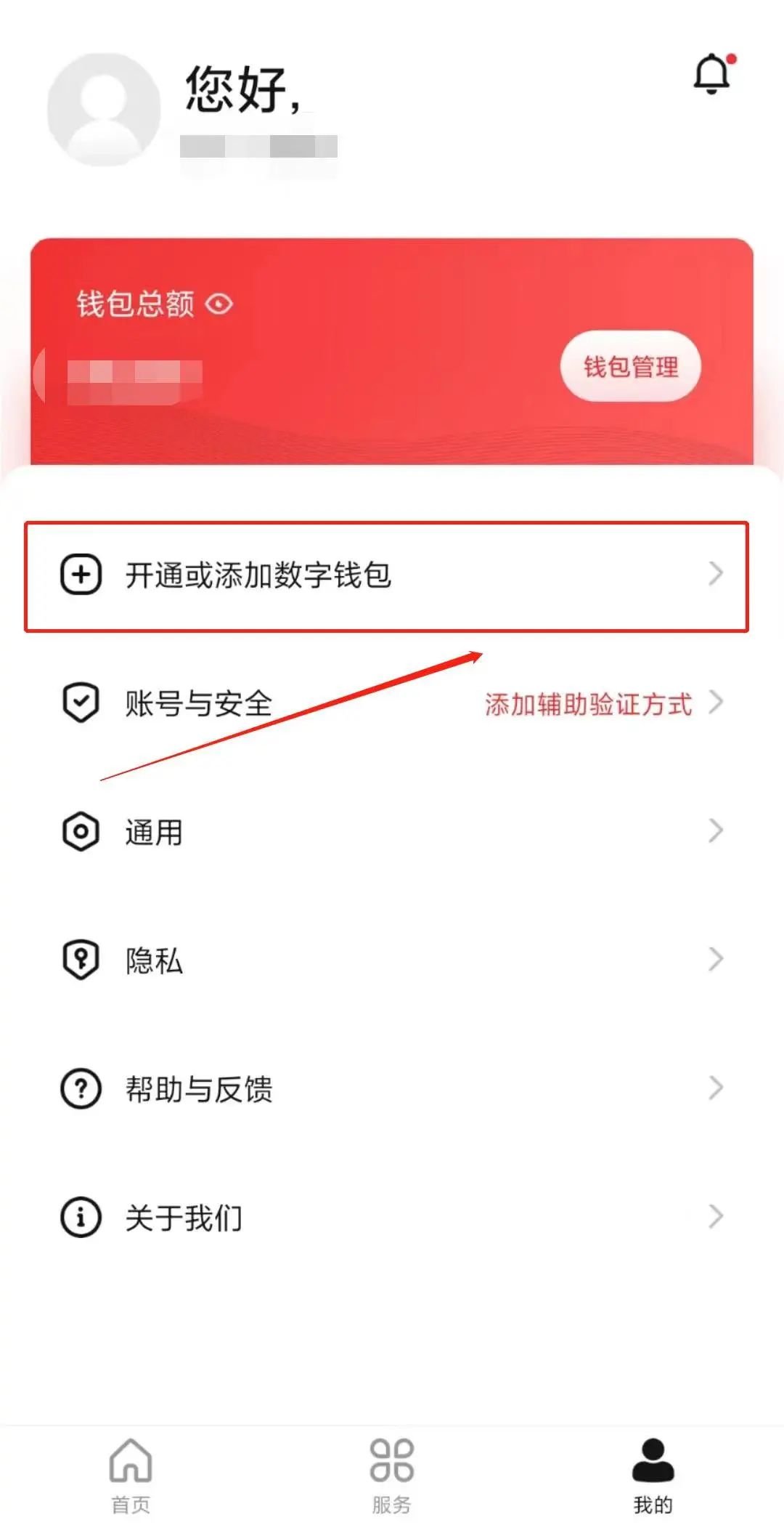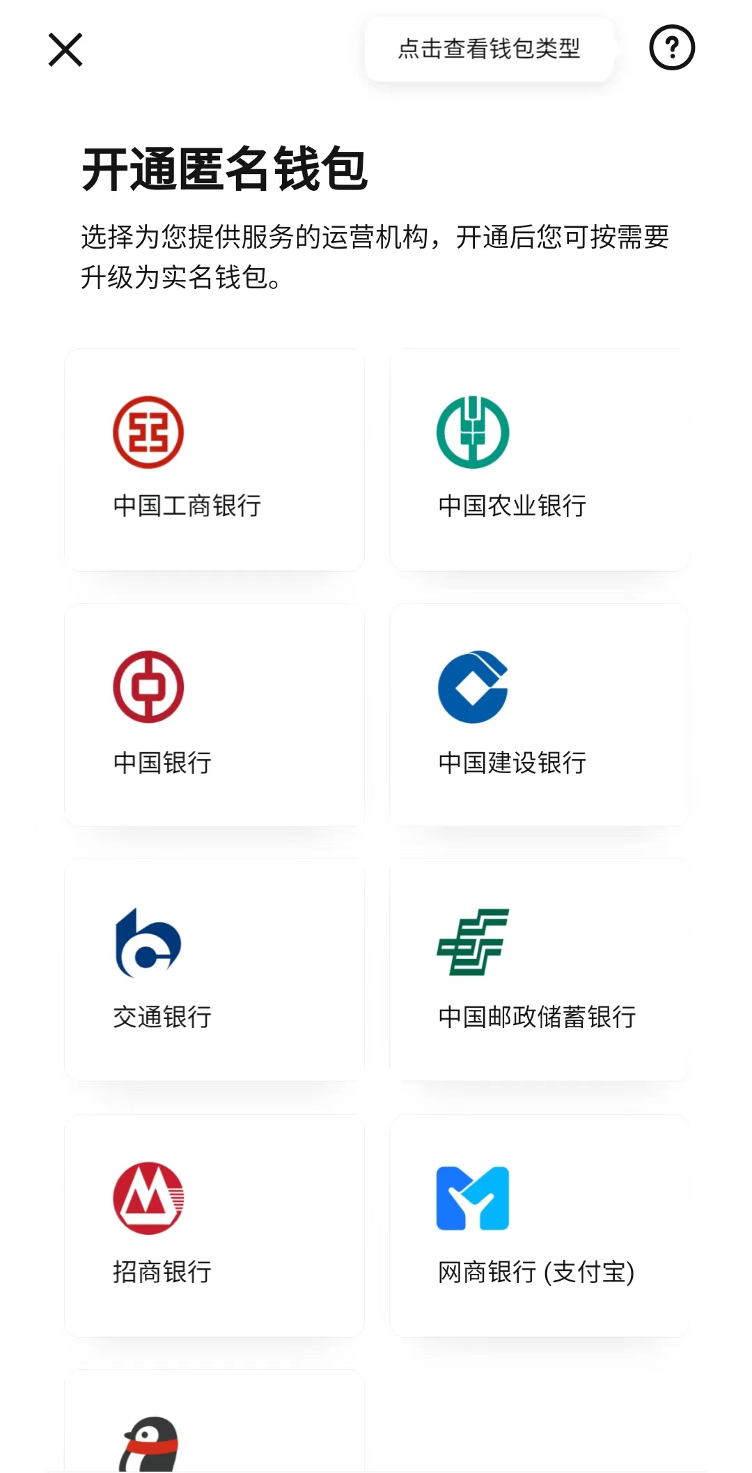 3、点击我的-开通或添加数字钱包,进入添加钱包页面,自行选择运营机构,开通四类匿名钱包。