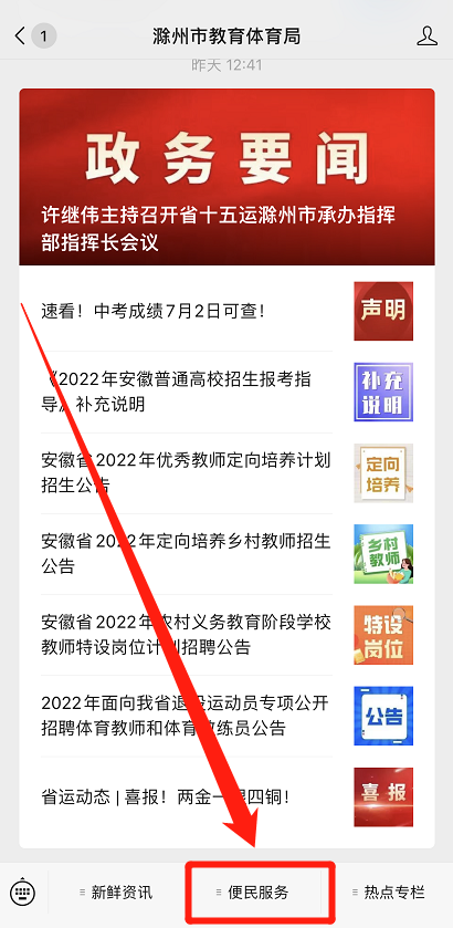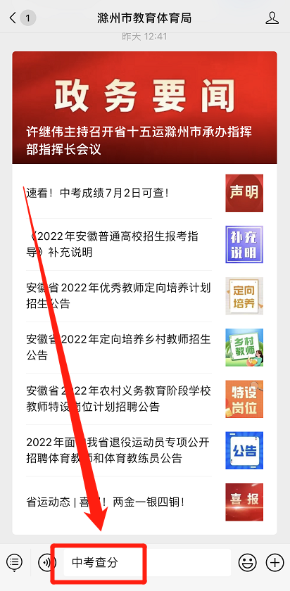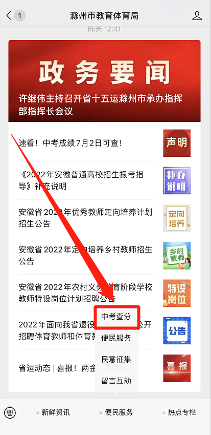 微信查询:关注滁州市教育体育局官方微信公众号,搜索“便民服务”菜单栏,点击“中考查分”栏目或者在微信公众号后台对话框输入“中考查分”点击“发送”即可弹出成绩查询链接(查分通道目前尚未开启)。