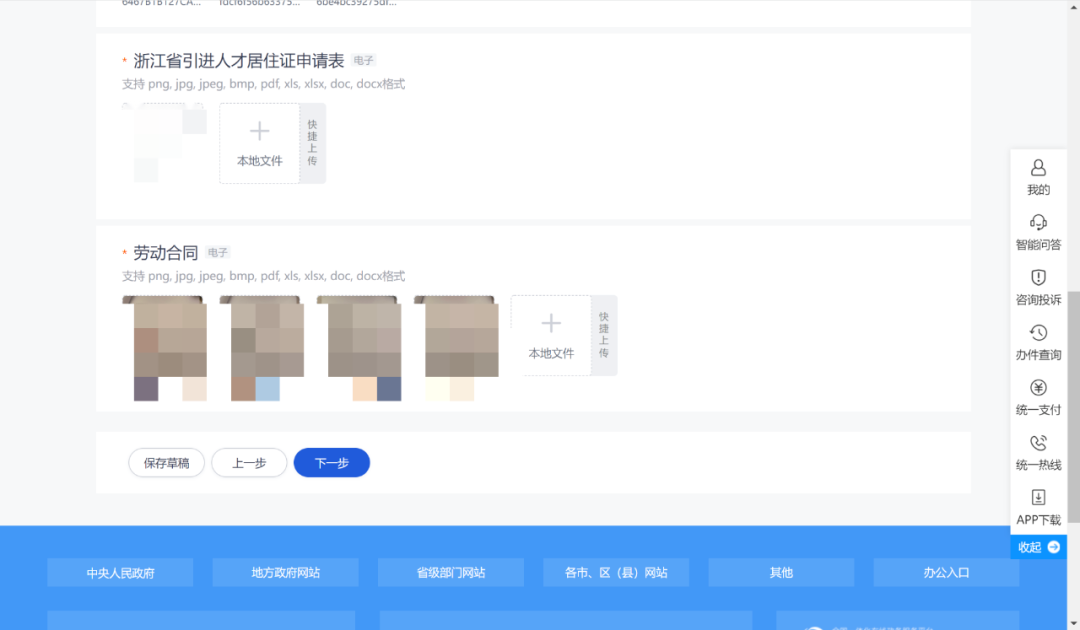 步骤5:依次上传申请人的职业资格证书、身份证、人才居住证申请表、劳动合同的原件照片或彩色扫描件,点击“下一步”;
