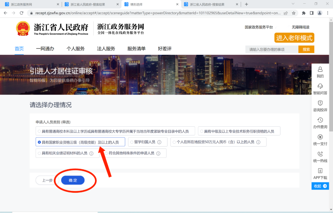 步骤3:选择申请人员类别,此处我们以“高级技能”条件举例,点击“确定”;
