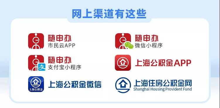 “随申办”app、“随申办”微信小程序、“随申办”支付宝小程序、“上海公积金”app、上海公积金微信、上海住房公积金网。