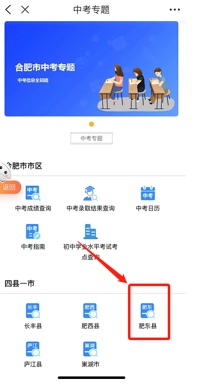 登录“皖事通”APP,在安徽省分厅点击首页中考服务专区轮播图或者在任一分厅搜索栏搜索关键词“中考”即可进入中考服务专区。选择“合肥”这个城市进入。然后选择庐江县进入查询页面。