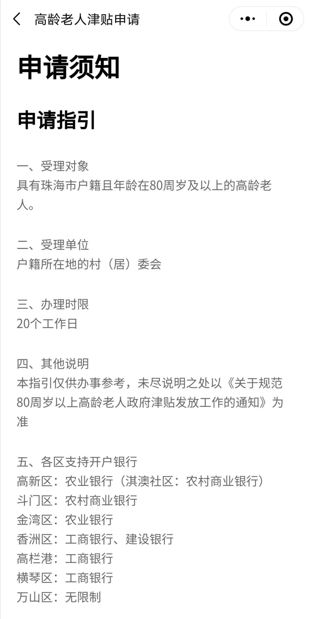 目前,广东已实现21个地市高龄老人津贴制度全覆盖。80周岁以上广东户籍老年人均可领取!部分地市年龄标准下调到70周岁。目前,珠海已实现在线申请,只要登录“粤省事”微信小程序,简单操作一下就可完成申请啦!