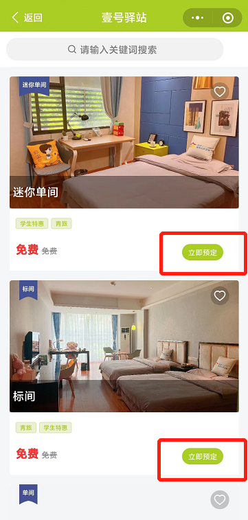 3、点击“壹号驿站”可进入查看门店详情,点击“立即预定”可进入查看可预定房间类型;