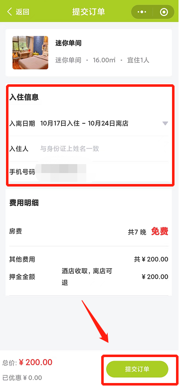 6、确认和补充预定入住信息,提交订单即可(需先缴纳押金费用,押金离店可退)。